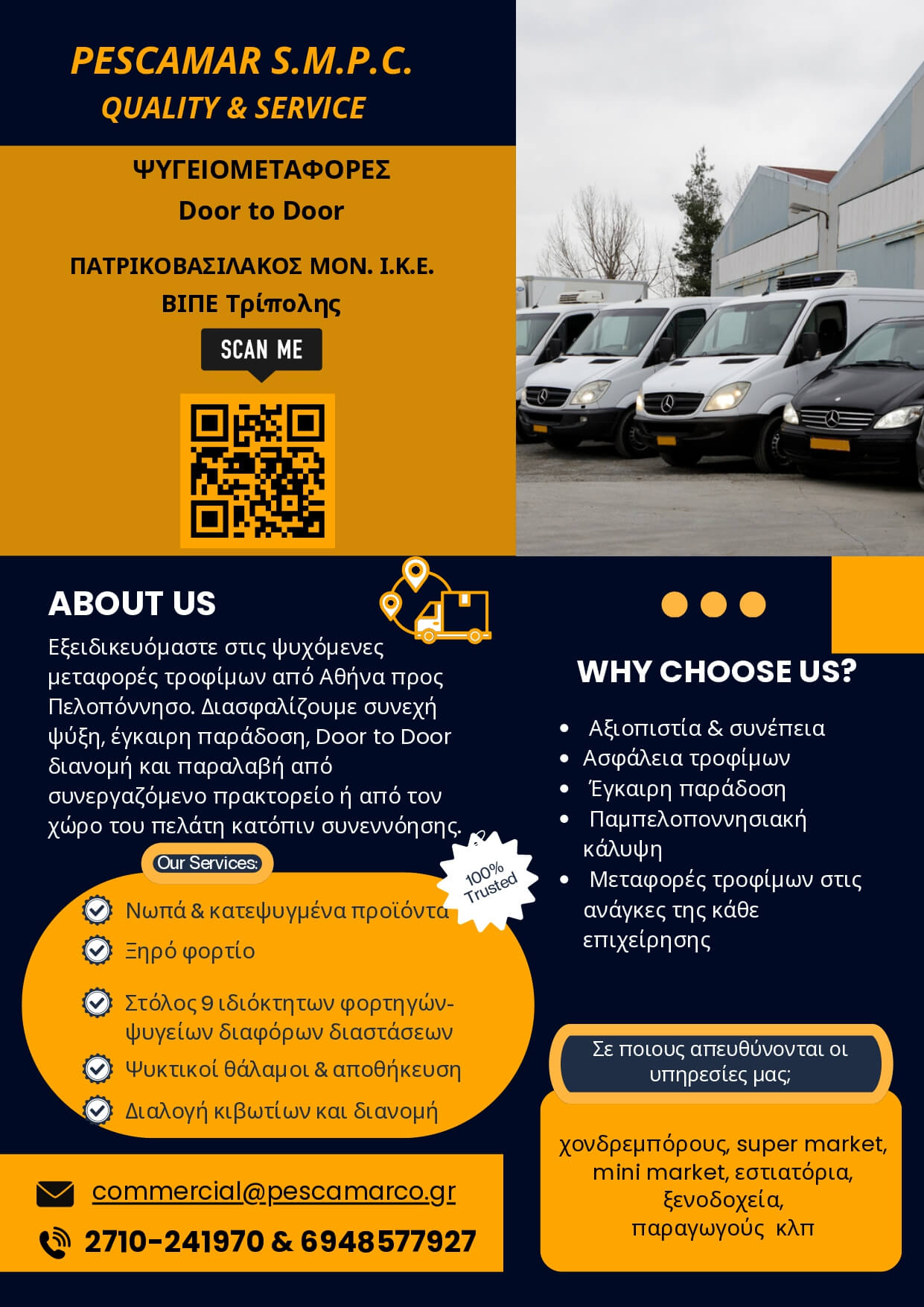 Διαθέτουμε μικρά και μεγάλα φορτηγά-ψυγεία, σύγχρονους ψυκτικούς θαλάμους και δυνατότητες αποθήκευσης, παρέχοντας ευέλικτες λύσεις προσαρμοσμένες στις ανάγκες κάθε επιχείρησης.