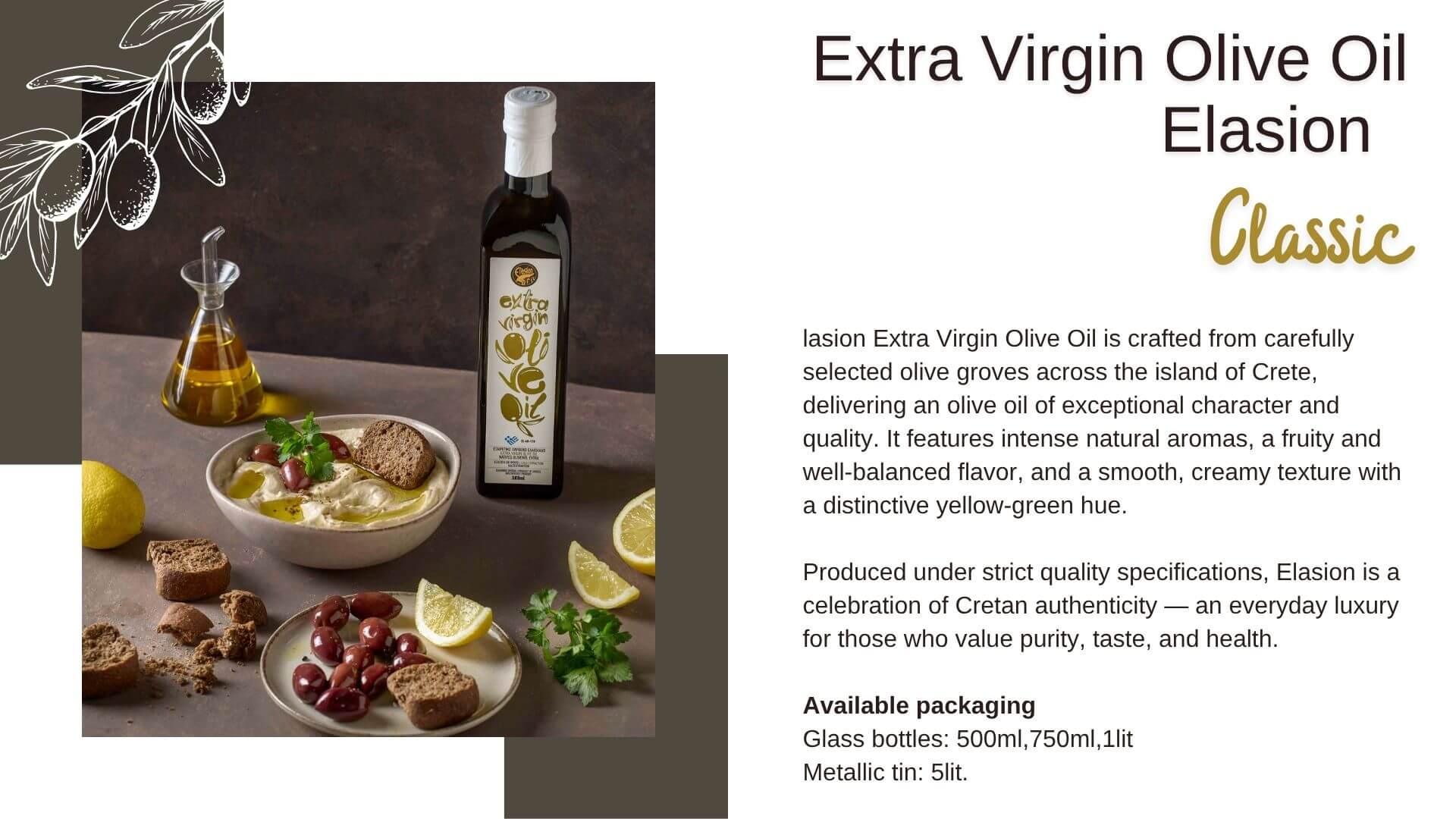 Production of olive oil and olive products , production of herbs and essential oils and production of grocery productsGold Elasion Extra Virgin Olive Oil is a premium product, crafted exclusively from Koroneiki olives...