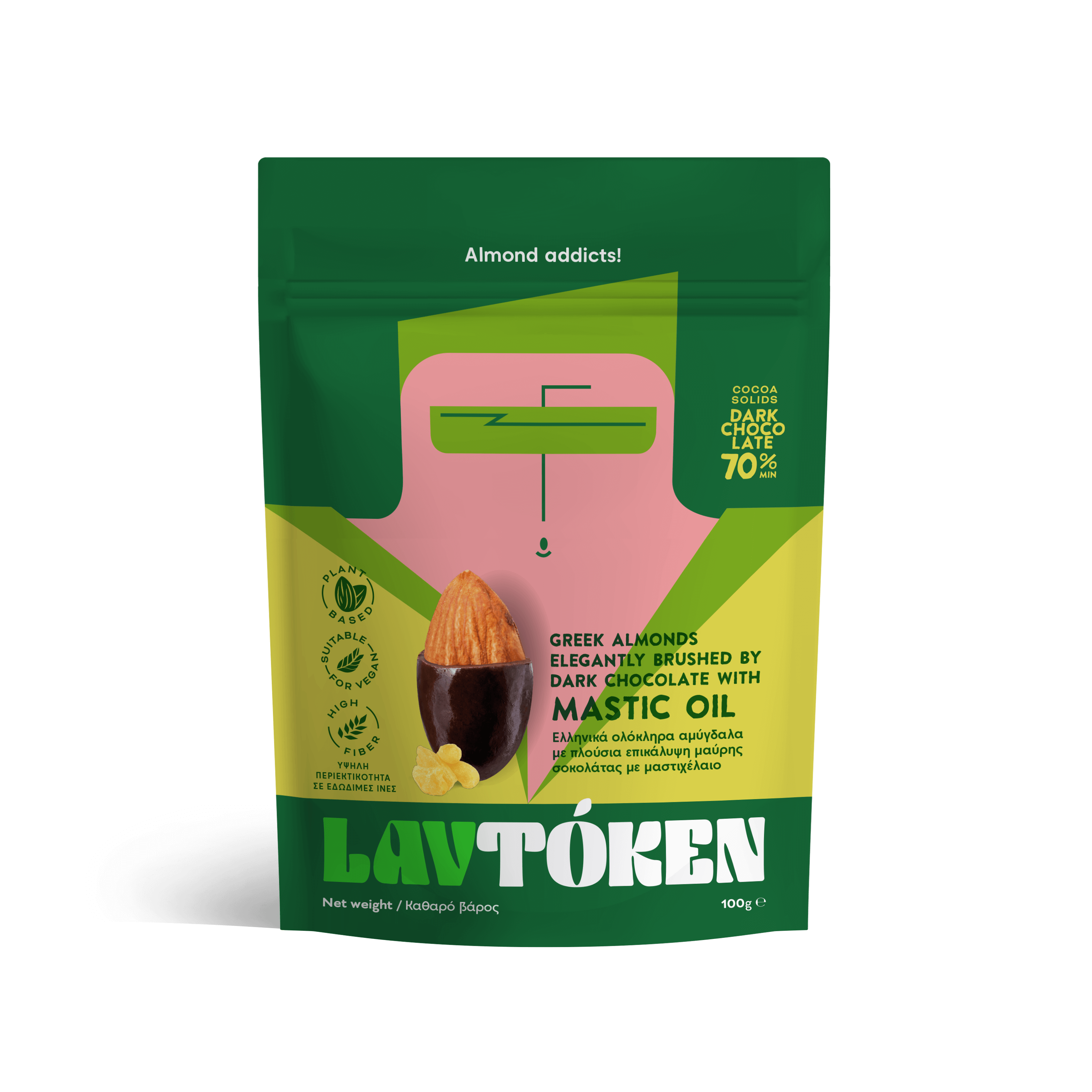 At the heart of this creation lie freshly roasted almonds, crunchy and naturally flavorful. The rich, velvety 70% dark chocolate provides an intense, deep taste profile with notes of coffee and nuts, perfectly enveloping the almond. The bittersweet chocolate is elegantly balanced by the airy, distinctive touch of mastic oil, which imparts a slightly aromatic, earthy hint, leaving a refreshing sensation on the palate.